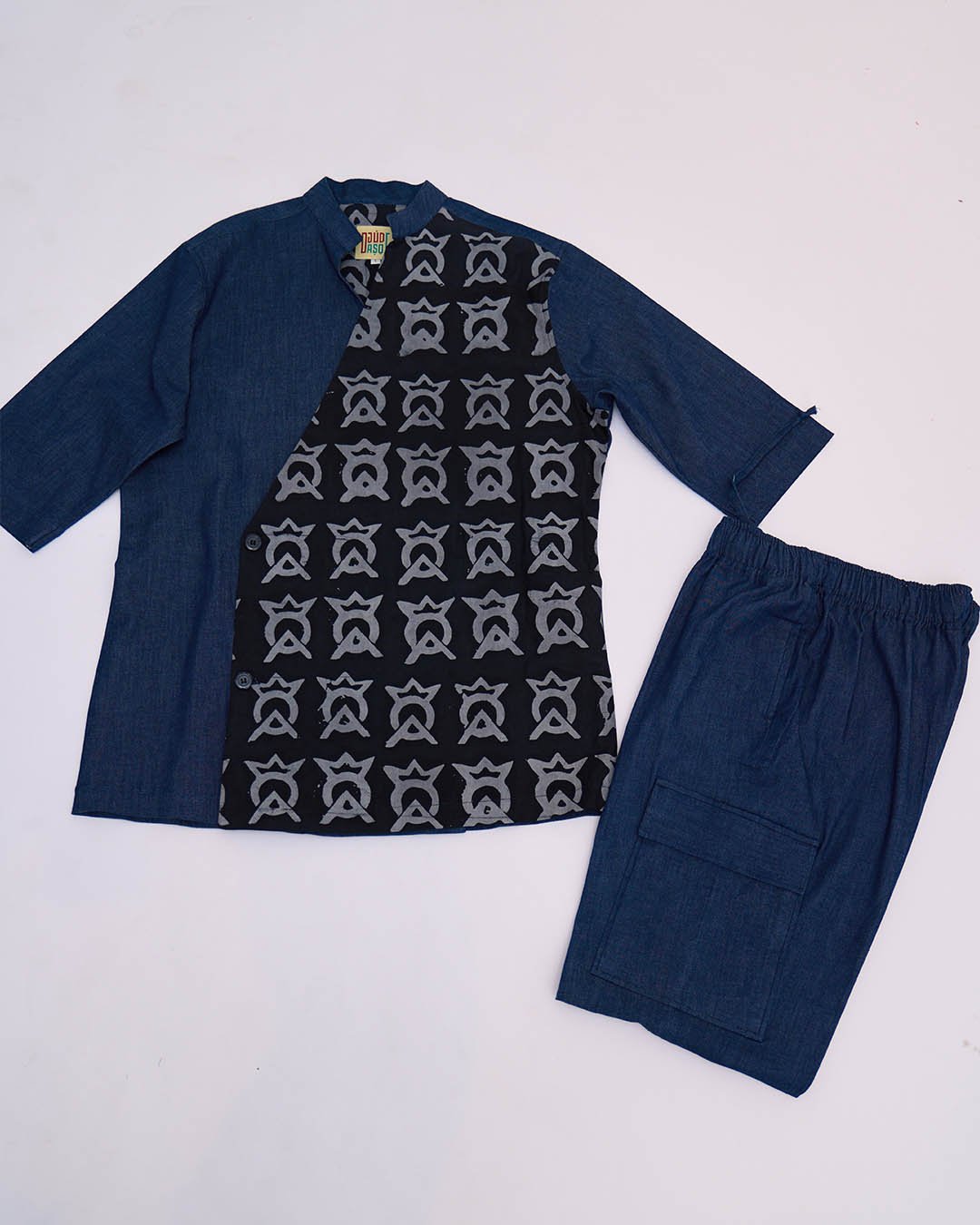 Where tradition meets street luxury Aládé Denim Shirt blends classic craftsmanship with bold urban tailoring. Crafted from premium denim and hand-dyed using the traditional Adire technique, this shirt features a repeat of the Ojudeaso “OA” Crown Symbol, a regal mark of heritage and identity.The pants feature a signature embroidered circle motif on the back pocket. Both are Designed to be worn together or separately.