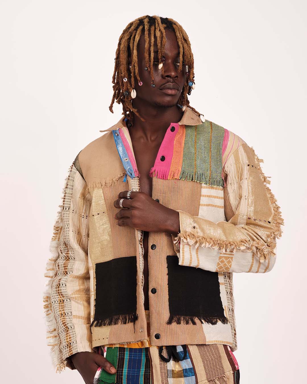 With its vibrant patchwork, raw frayed edges, and intricate weaving, the Aso Ará Jacket is both rugged and refined . a wearable artifact that celebrates African excellence.
